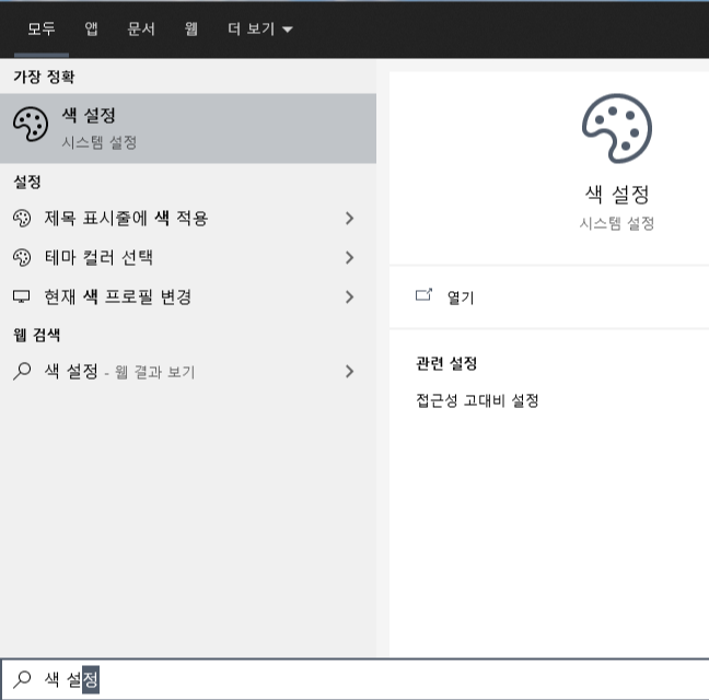 (Windows(로고) 키 를 누른 후 검색창에 '색 설정'을 입력해도 가능합니다. )