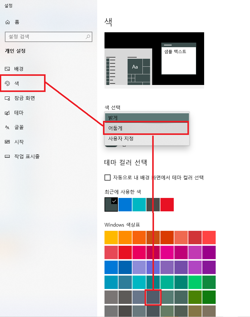 2. 색설정 화면에서 색 선택 -> '어둡게'를 선택해주면 다크모드로 설정됩니다.