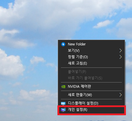 1. 바탕화면 -> 마우스 우클릭 -> 개인설정-> 색 화면에 들어갑니다.