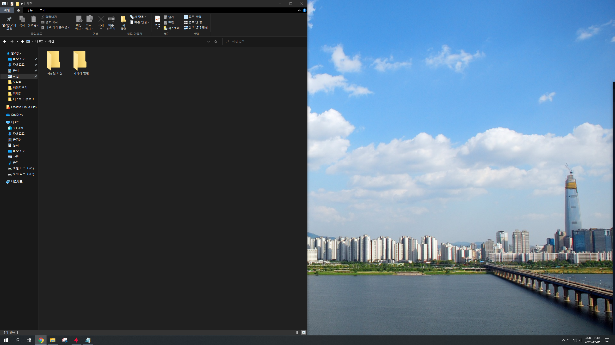 첫번째 방법으로는 분할하고 싶은 화면을 바탕화면 좌우 가장자리로 가져가면 자동으로 분할이 됩니다.